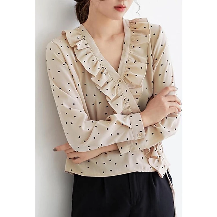 Áo sơ mi nữ chấm bi dài tay xéo vát quấn bèo tiểu thư, thời trang hè thu 2022