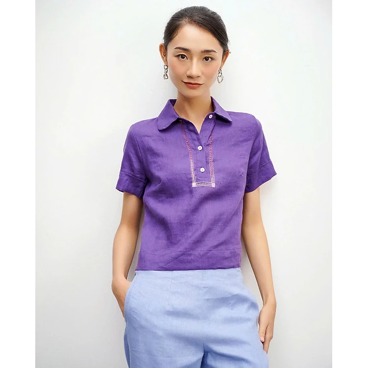 Áo Sơ Mi Nữ Cổ Trụ Tay Ngắn, Áo Sơ Mi Rua Rút Chỉ Linen Tím TOP195 thời trang thiết kế Hity