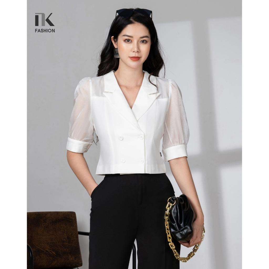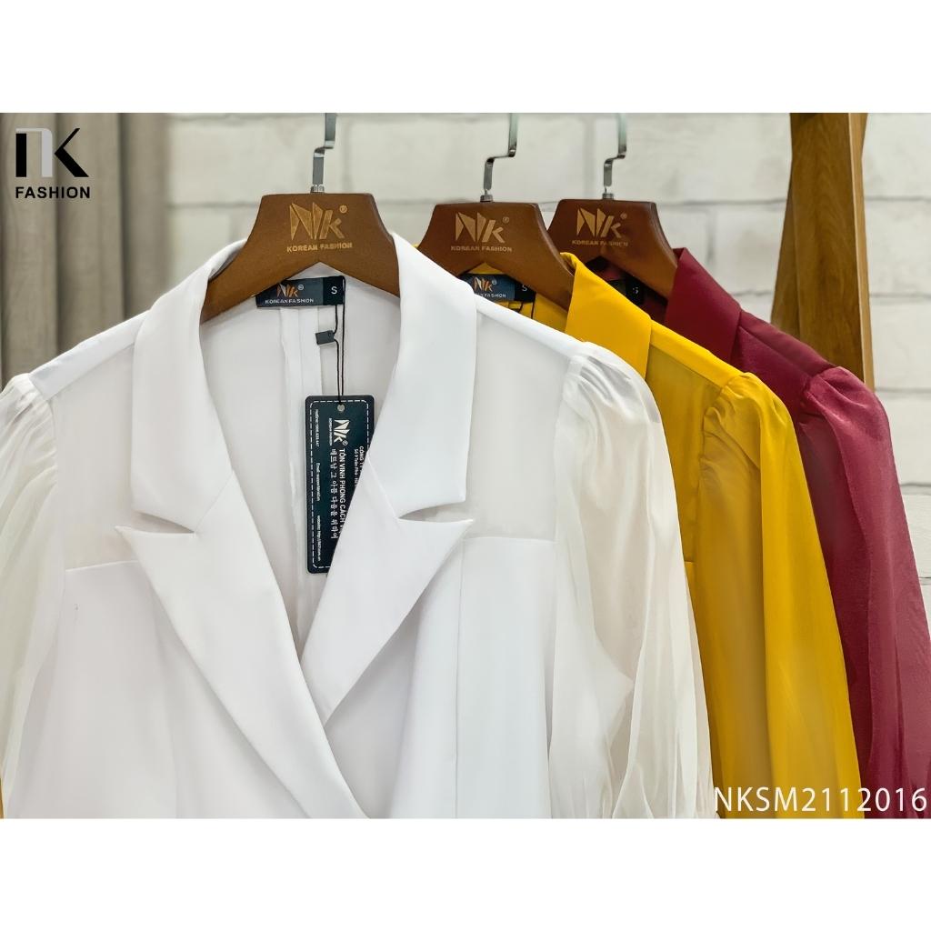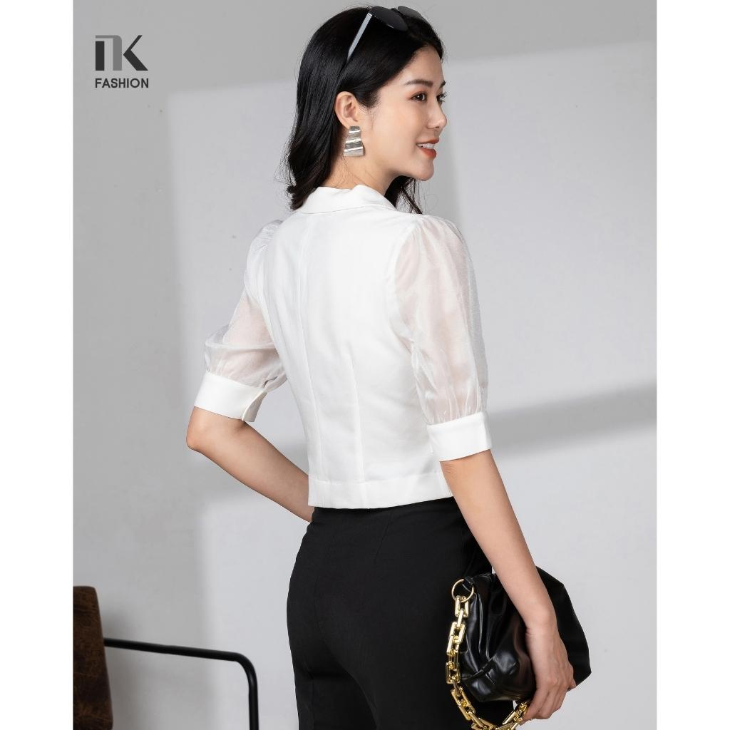 Áo Sơ Mi Nữ Công Sở Cổ Vest NK Fashion Tay Lỡ Giao Cúc Phối Tơ Ánh, Chất Liệu Nhập Hàn Mềm Mịn NKSM2112016
