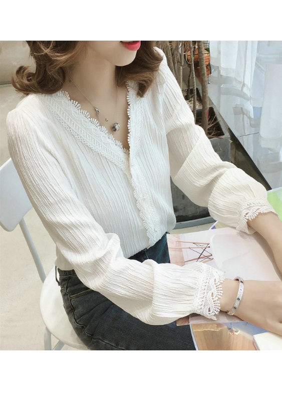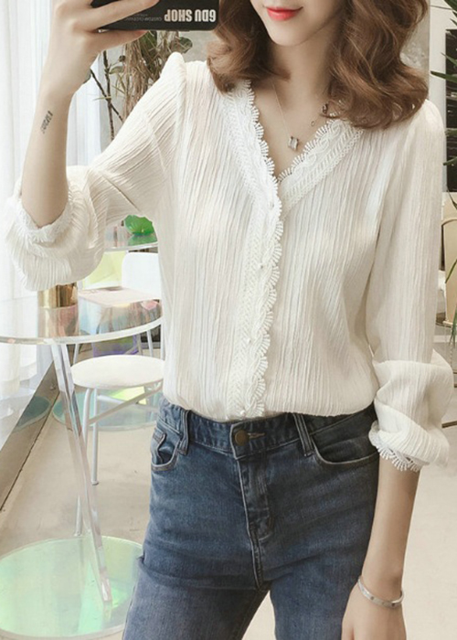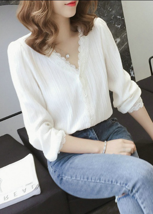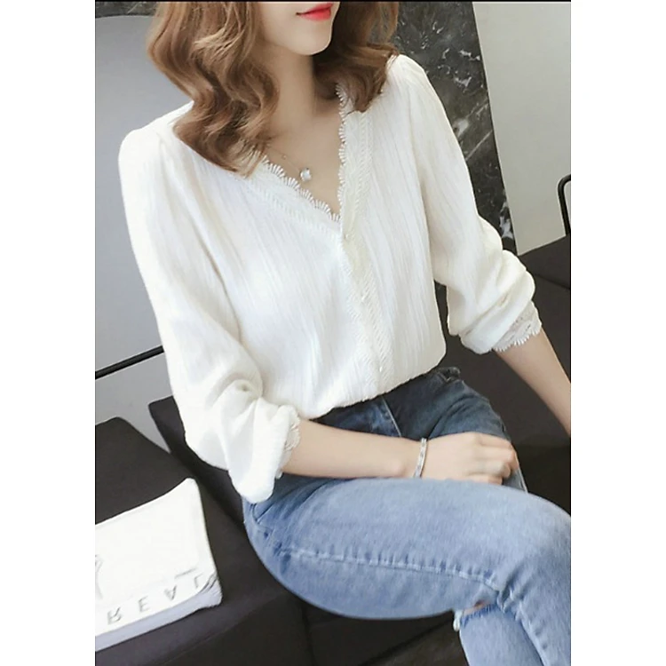 - Áo sơ mi nữ dài tay cổ V phối ren mua thu LAH fashion được thiết kế thanh nhã với kiểu áo form rộng trẻ trung.