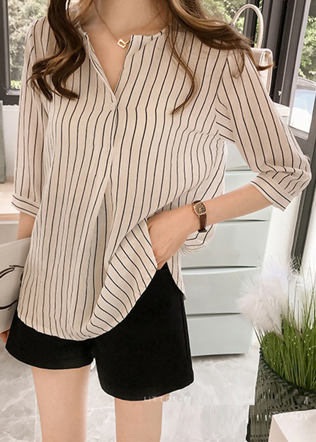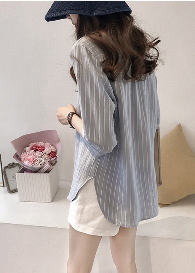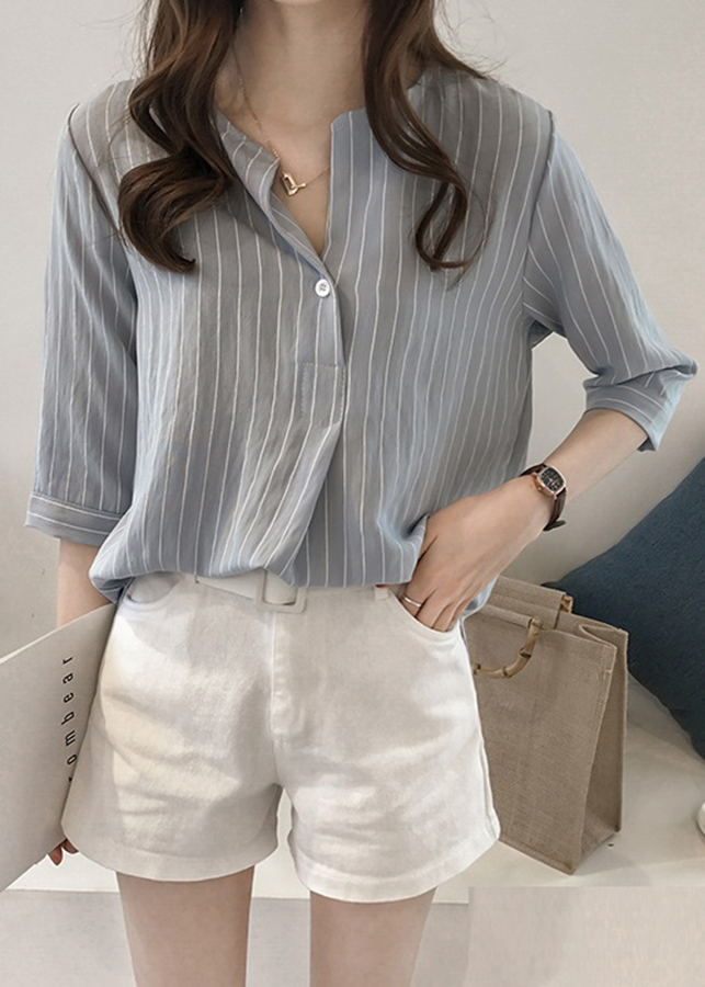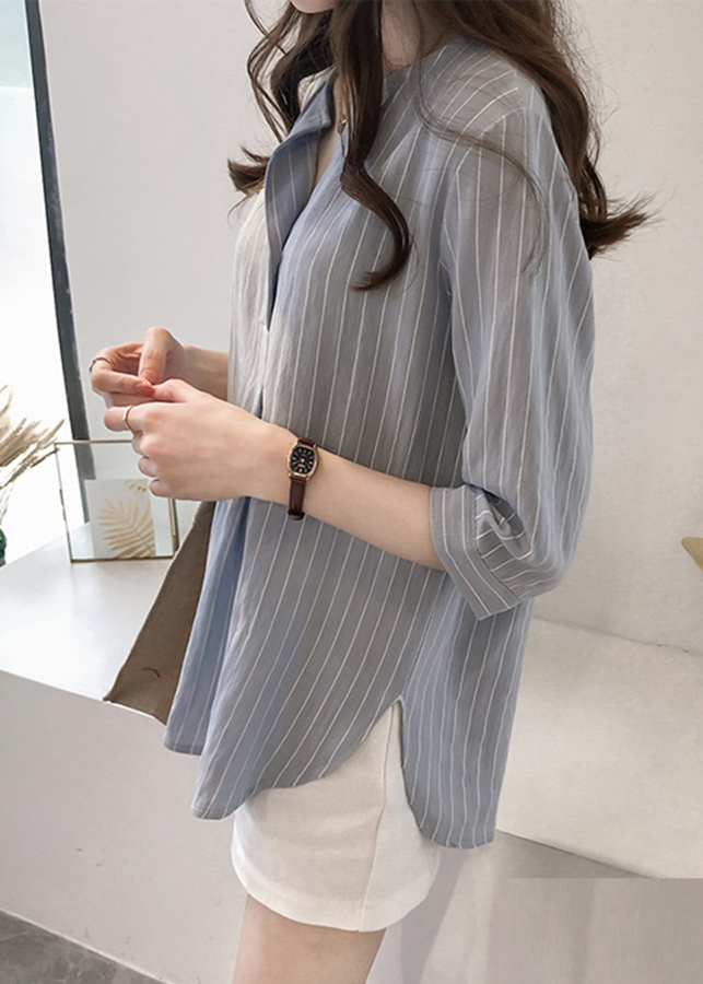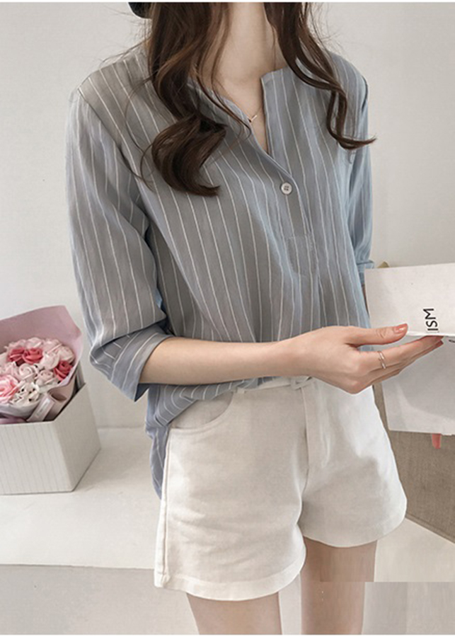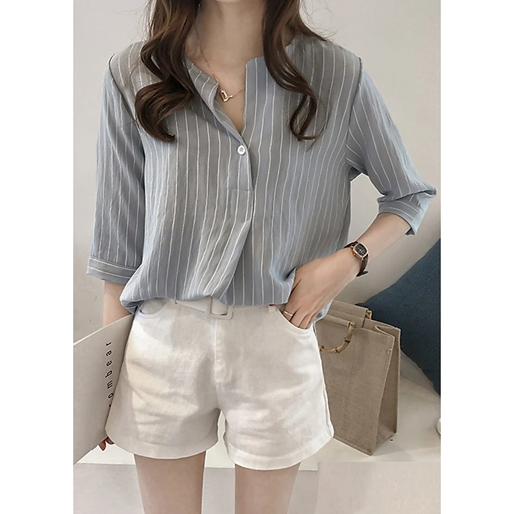- Áo sơ mi nữ kẻ sọc cổ tròn cúc ngực A-LAH08