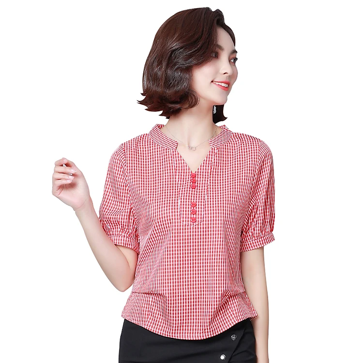 - Kiểu dáng: Áo chui đầu, cổ V đính nút, tay ngắn, đính nút sau lưng tạo điểm nhấn