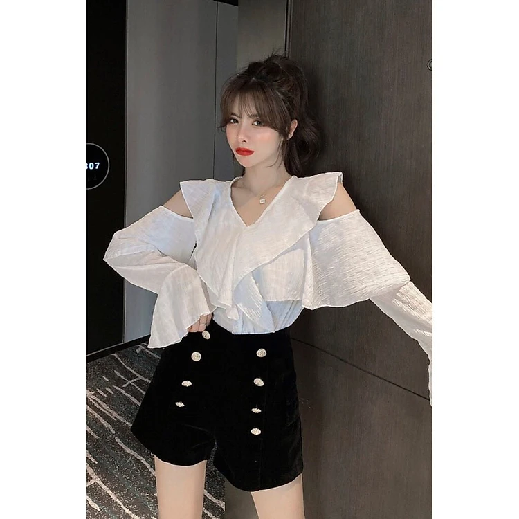 Áo sơ mi nữ thời trang dài tay hở vai nhún bèo - Hàng cao cấp
