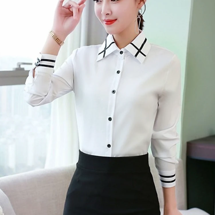 Áo sơ mi nữ trắng, áo sơ mi nữ công sở kiểu dáng basic, phối hạo tiết đen ở cổ và tay làm điểm nhấn HB147