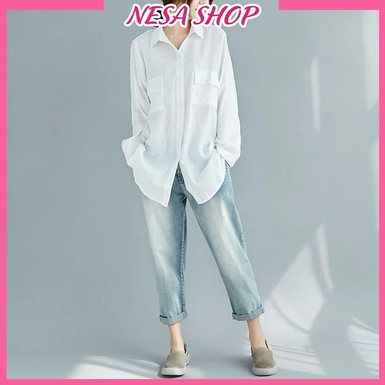 Áo sơ mi nữ trắng dài tay, áo form rộng, chất liệu Đũi tơ mềm mịn, sơ mi nữ đẹp phong cách Hàn Quốc NeSa Shop AKH.47