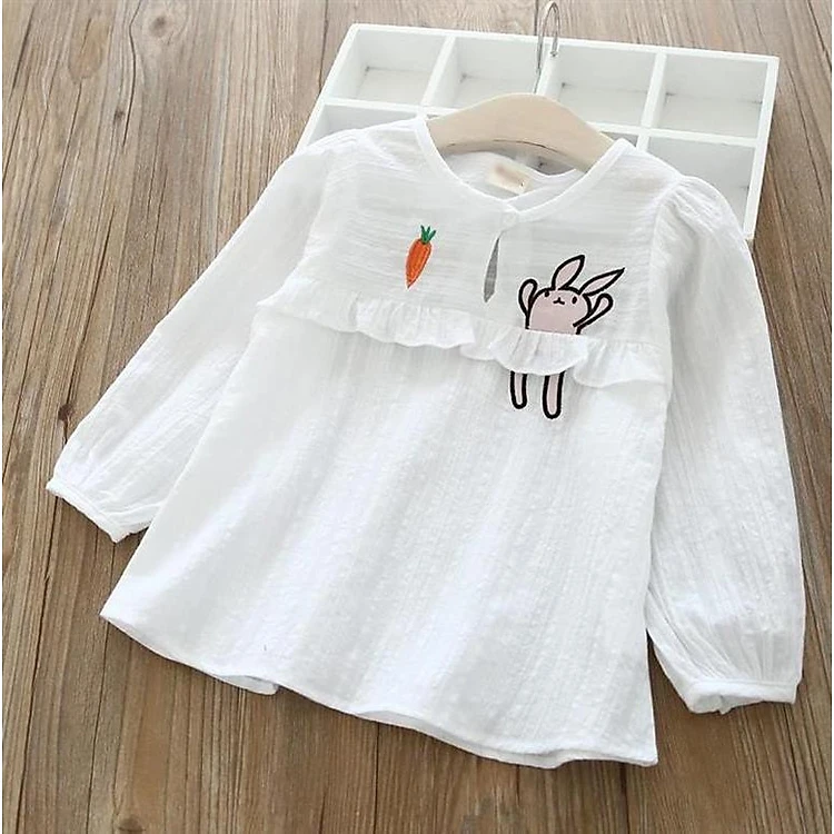 Áo sơ mi trắng thêu thỏ bé gái 3-8 tuổi với họa tiết thêu chú thỏ và quả cà rốt