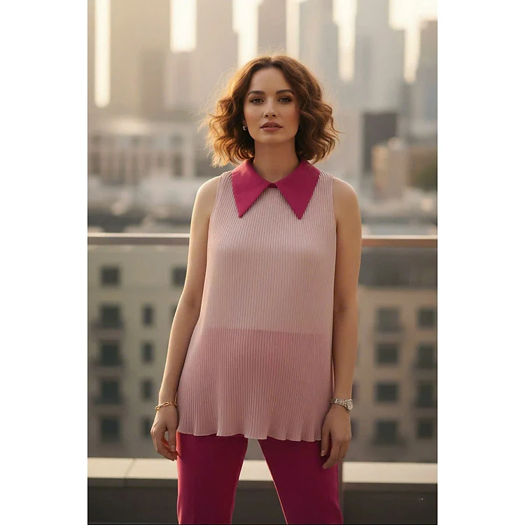 Áo Sơ Mi Vai Yếm Dập Ly, Áo Sát Nách Cổ Sơ Mi Hồng thời trang thiết kế Hity TOP246