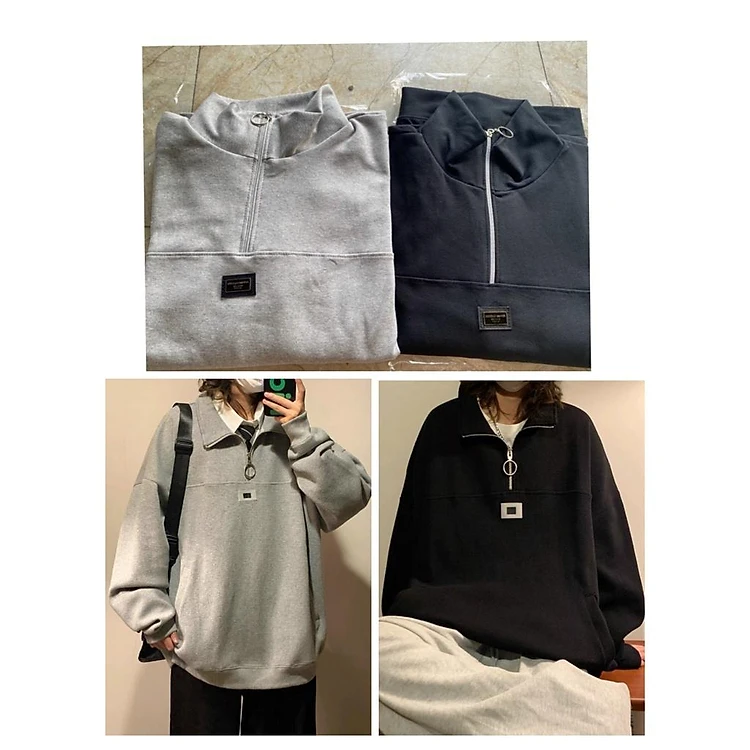 Áo Sweater Nỉ Zip Logo Ngực Cổ Cao Dáng Thụng 2 Màu Unisex Siêu Basic - Áo Nỉ Cổ Polo Dáng Trơn Thêu Logo