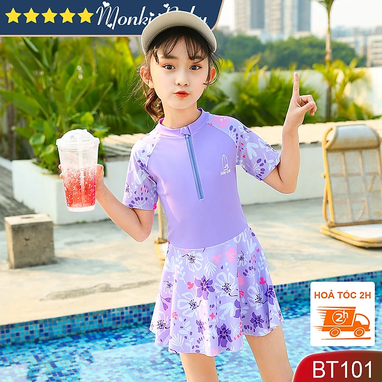 Áo tắm liền thân dáng váy bé gái, quần đùi liền trong váy, chất thun bơi lạnh co giãn tốt, chống nắng nhanh khô, màu sắc họa tiết nữ tính, size từ 10-40kg | BT24