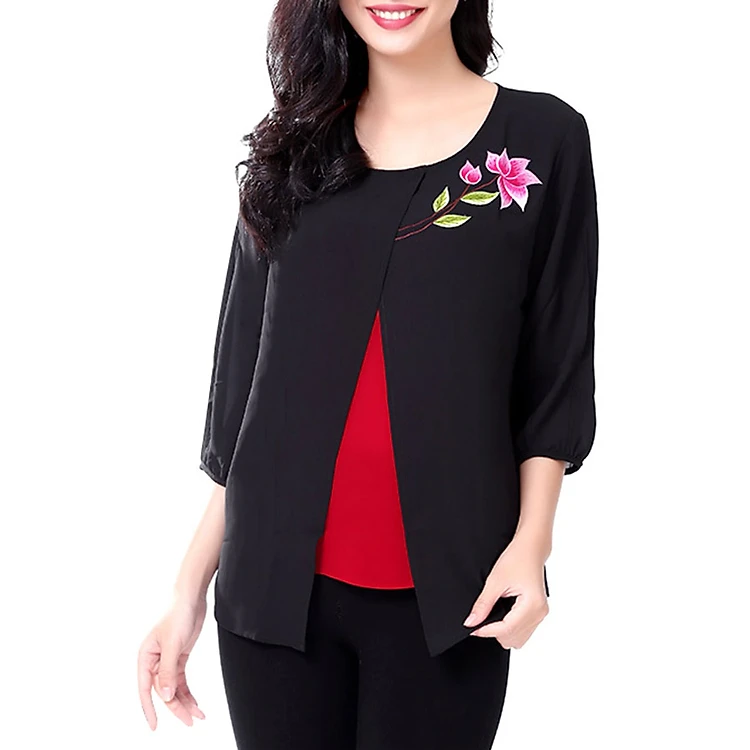 • Thiết kế áo cổ thuyền 2 lớp, tay lửng bo nhẹ trẻ trung cùng chi tiết thêu trên phần vai giúp tôn lên vóc dáng thanh tao, thon gọn của bạn nữ.