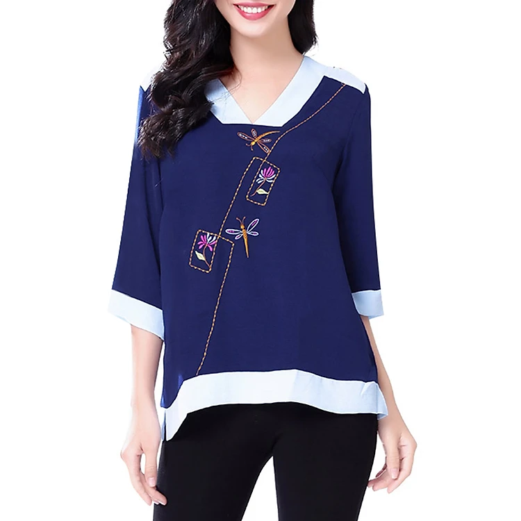 Áo Thêu Cổ V Oversize An Thủy 686 - Xanh Đen