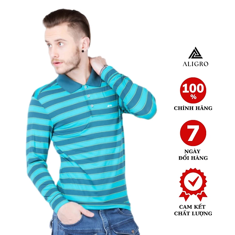 Áo thun tay dài cổ bẻ kẻ màu xanh ngọc Aligo ALGAPD012