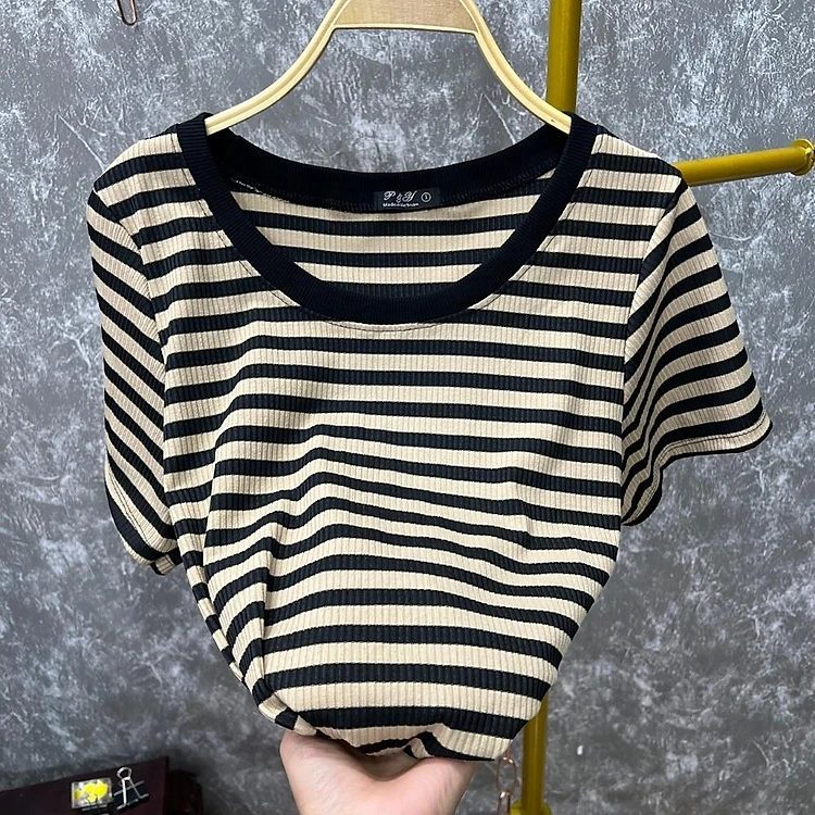 Áo thun bigsize nữ cổ tròn viền tay ngắn thời trang cơ bản hoạt tiết sọc chất liệu thun tăm gân MM