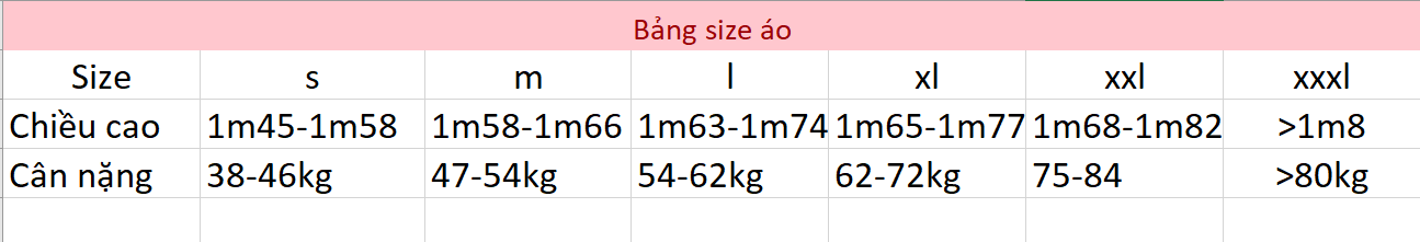 Có đủ các size XS, S, M, L, XL, 2XL,3XL đáp ứng cho mọi khách hàng