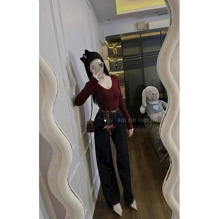 Áo thun dài tay nữ cổ tim có đệm vai HOT HIT