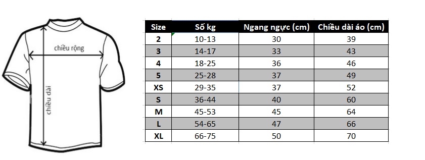 BẢNG SIZE THAM KHẢO CHO BÉ: