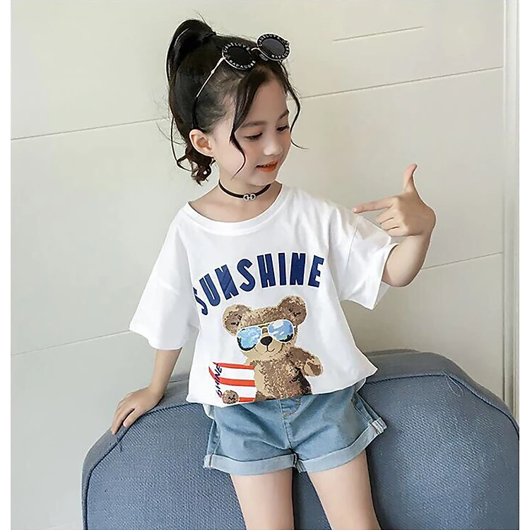 Áo thun bé gái 8 đến 32 kg in gấu croptop cho bé gái 6 tháng đến 10 tuổi từ tay ngắn cổ tròn 04130-04145