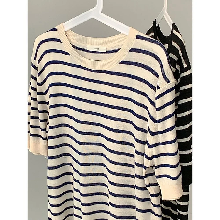 Áo thun nữ Ngắn tay kẻ sọc ngang Chất len mỏng Cổ tròn Áo phông Tay ngắn nữ Form rộng Mùa Hè Thời trang