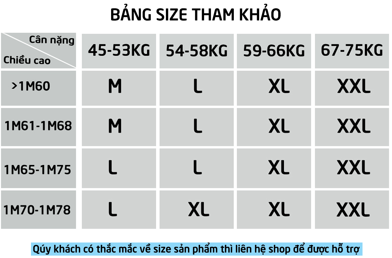 Bảng kích thước mang tính chất tham khảo, để lựa chọn đúng kích thước chuẩn của mình, anh/chị vui lòng chat với CSKH, các bạn sẽ giúp mình chọn đúng size nhé!