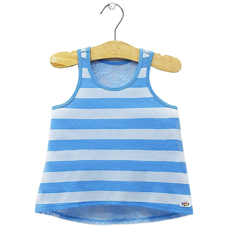Áo có thiết kế sát nách và cổ tròn tạo kiểu dáng năng động, đẹp mắt. Mặt sau phối ren có họa tiết nhẹ nhàng, xinh xắn. Form áo xòe tạo sự thoải mái tối ưu cho bé khi mặc. Áo có màu sọc xanh da trời phối trắng tô điểm nét tươi tắn cho bé gái.