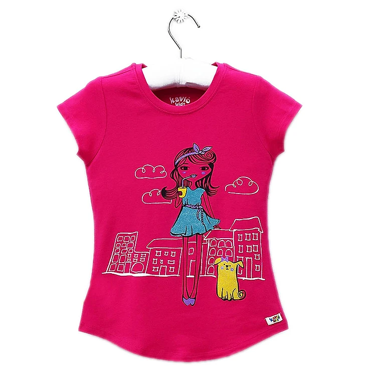 Áo được in hình cô gái xinh đẹp đang dắt thú cưng đi dạo trông thật vui mắt. Phía sau in hình những tòa nhà cao tầng sinh động, ngộn nghĩnh. Áo có màu hồng cam chủ đạo mang đến vẻ ngoài dễ thương và đáng yêu cho các nàng tiểu thư nhỏ.
