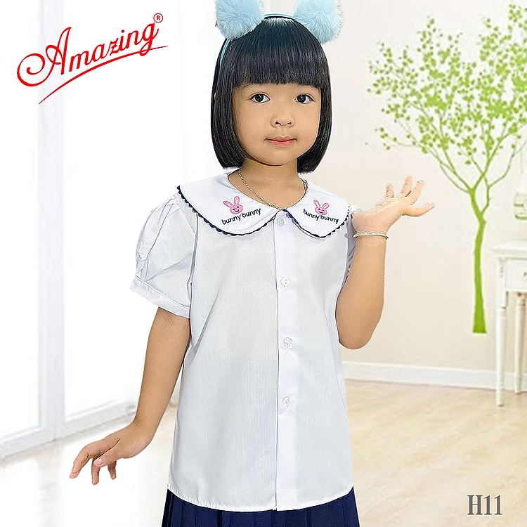 Áo trắng học sinh nữ tiểu học, cổ lá sen thêu nhiều mẫu rất xinh, tay bồng, vải KT silk mềm mượt mát