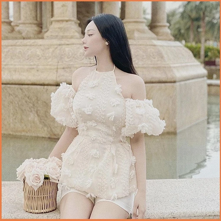 - Sản phẩm: Áo trễ vai cổ yếm nữ chất tơ hoa [2 Lớp] Áo kiểu tay bồng dáng xòe A-CY3