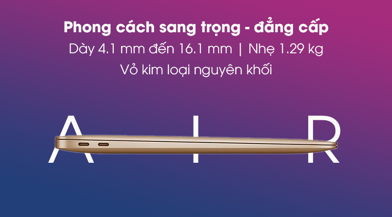 Được chế tác tinh xảo từ kim loại nguyên khối tái chế, Apple đem đến một phiên bản Apple Macbook Air 2020 M1 sang trọng, đẳng cấp nhưng vẫn giữ được độ mỏng nhẹ, đề cao tính di động, bắt kịp xu hướng hiện nay.
