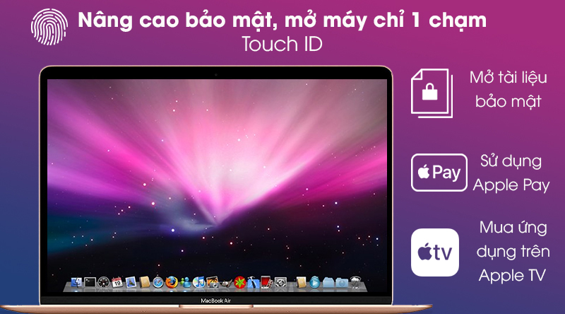 Chip bảo mật T2 mã hóa mọi thông tin trên máy đảm bảo thông tin cá nhân của bạn. Đăng nhập vào máy dễ dàng bằng bảo mật vân tay, hỗ trợ thanh toán online cực kì nhanh chóng và tiện lợi.