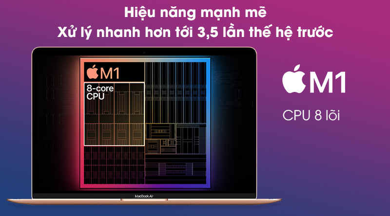 MacBook Air 2020 lần đầu giới thiệu con chip M1 mà Apple thiết kế đặc biệt dành cho MacBook có CPU 8 lõi cùng với Neural Engine 16 lõi đem đến tốc độ CPU nhanh hơn tới 3,5 lần. GPU 7 lõi tăng hiệu suất nhanh hơn tới 5 lần so với thế hệ trước. Các ứng dụng văn phòng, giải trí đến đồ họa, chỉnh sửa hình ảnh lẫn dựng vlog, edit video đều không thể làm khó chiếc MacBook thế hệ mới này.