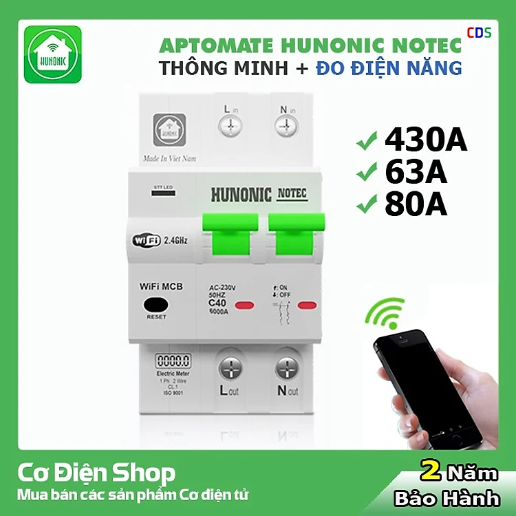 Aptomat thông minh - ĐIỀU KHIỂN TỪ XA - Đo điện năng - Hunonic Notec 40A 63A 80A - Công nghệ 4.0