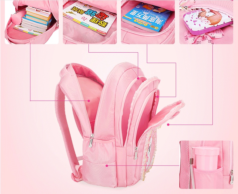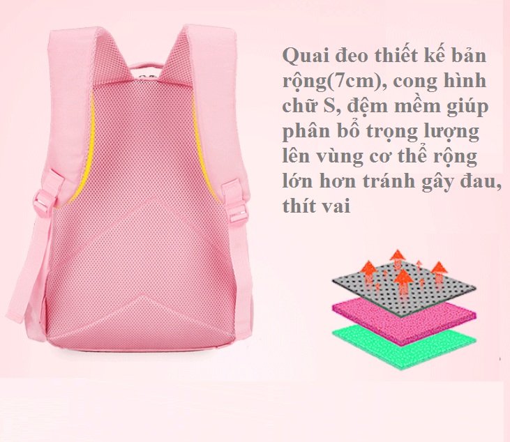 Khóa kéo nhẹ, êm bằng inox không rỉ . Quai xách phía trên được thiết kế chắc chắn, có đệm mút dày giúp bé không bị đau tay khi mang xách nặng.