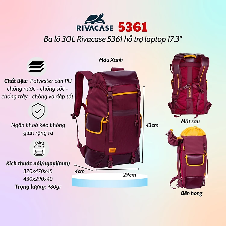 Balô 30L Rivacase 5361 Để Vừa laptop 17.3" - Bảo Hành 24 Tháng - Hàng Chính Hãng