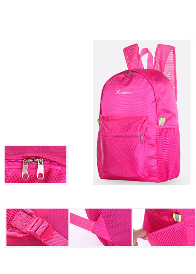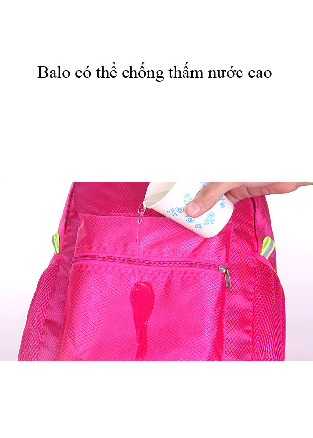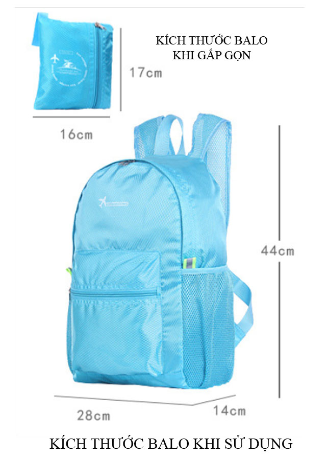 * Thiết kế: Bên trong có 01 ngăn lớn để chứa đồ và 01 túi nhỏ để đựng balo khi gấp gọn (túi nhỏ này được gắn liền với balo). Bên noài có 01 ngăn nhỏ có khóa kéo + 02 ngăn nhỏ ở 02 bên để đựng chai nước.