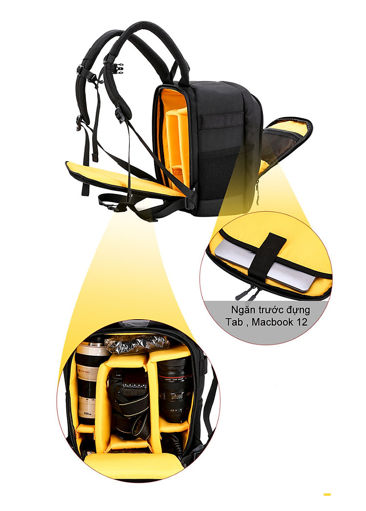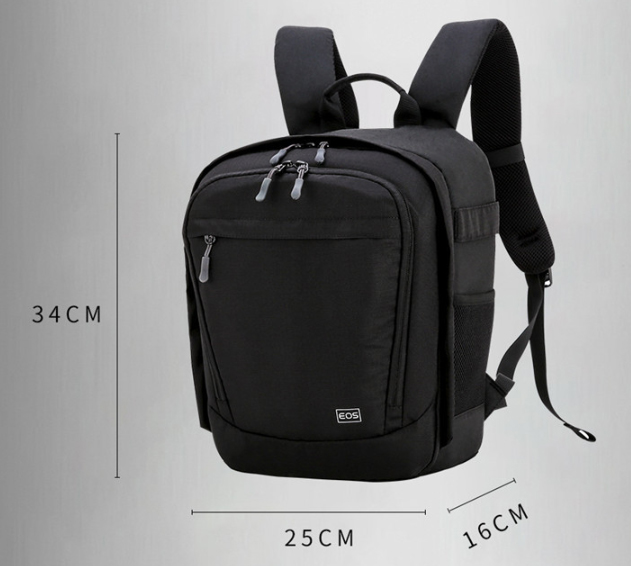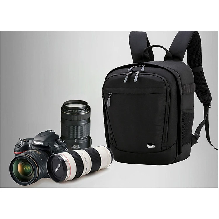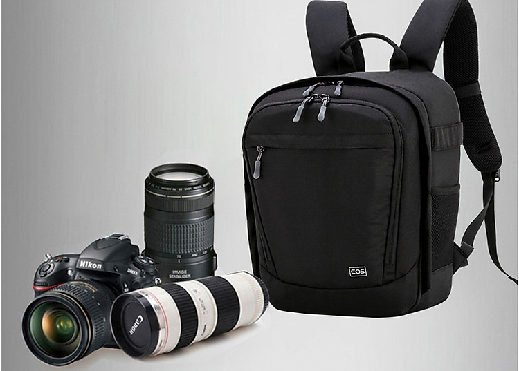 - Balo EOS mini có thể đựng được 1 body DSLR cùng với 3 ống kính zoom (lên đến 70-210mm), 1 đèn flash và iPad. Thiết kế tiện dụng, thông thoáng, tạo cảm giác thoải mái đến người dùng. Ngoài ra thiết kế khóa mở sau thông minh sẽ đảm bảo an toàn cho máy ảnh và phụ kiện của bạn khi đi qua những nơi đông người. Có nhiều ngăn phụ kiện để bạn dễ dàng đựng các món như , bút lau lens và các phụ kiện nhỏ khác.Hai bên hông có móc treo máy ảnh và một túi lưới để bạn đựng chai nước. Dây đeo và quai chắc chắn.