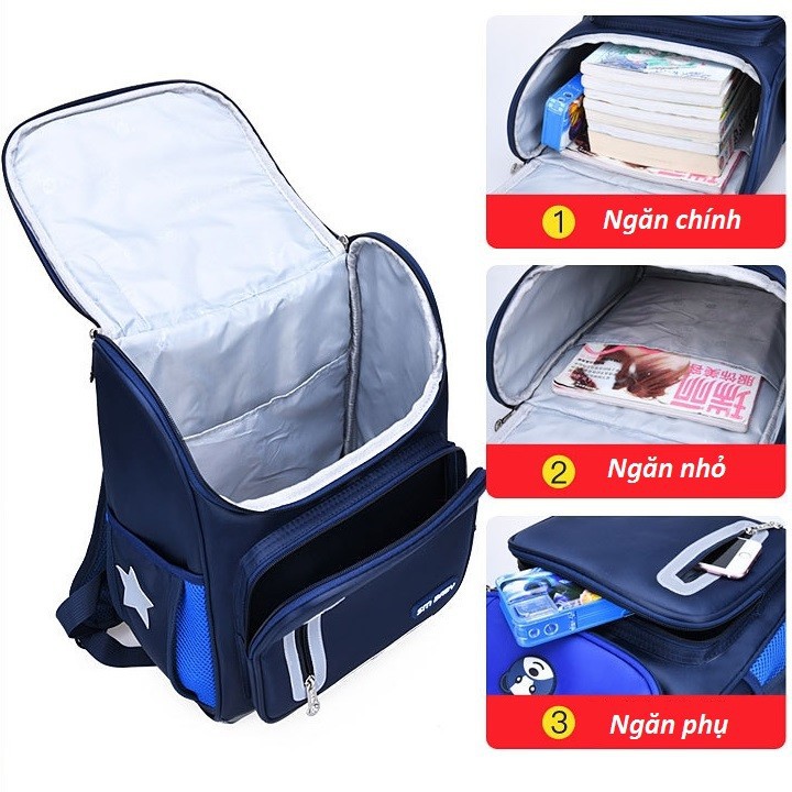 - Ngăn chứa có ngăn chính và nhiều ngăn phụ nên thoải mái đựng đồ dùng học sinh cho bé.
