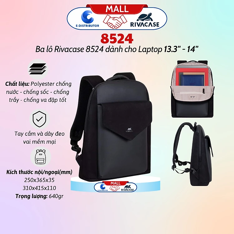 Balô Rivacase 8524 Để Vừa Laptop 13.3" - 14" - Bảo Hành 24 Tháng - Hàng Chính Hãng