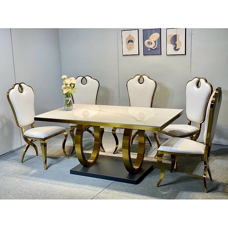 Bàn ăn mặt đá cẩm thạch chân inox mạ vàng PVD kết hợp ghế Queen