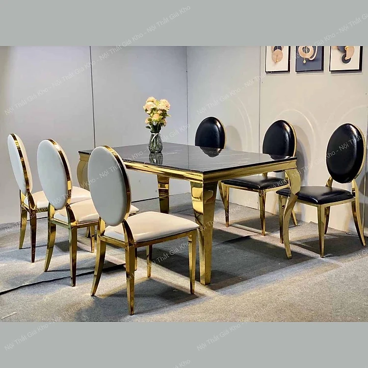 Bàn ăn mặt đá cẩm thạch nhân tạo cao cấp, chân inox mạ vàng PVD kết hợp ghế Louis