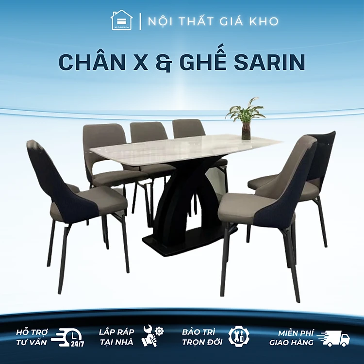 Bàn ăn mặt đá ceramic bóng chân chéo chữ x cong kết hợp ghế Sarin