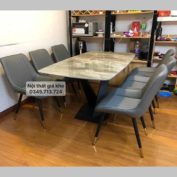 Bàn ăn mặt đá ceramic bóng chân chéo chữ X kết hợp ghế loft