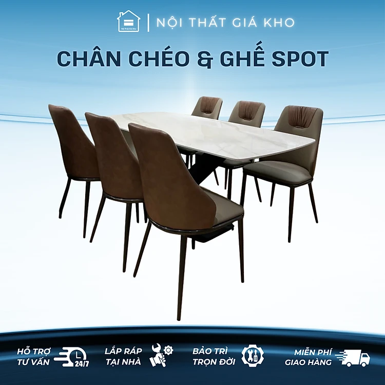 Bàn ăn mặt đá ceramic bóng chân chéo kết hợp ghế spot, bàn ăn mặt đá hiện đại 4 ghế 6 ghế 8 ghế