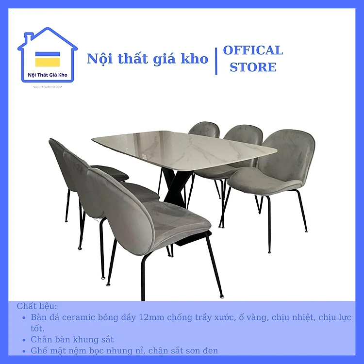 Bàn ăn mặt đá ceramic bóng trắng vân mây, ghi bóng, loang nâu chân chéo chữ X kết hợp ghế Gubi