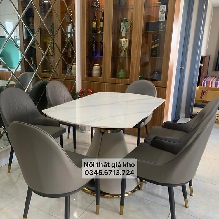 Bàn ăn tròn xoay mặt đá ceramic bóng, chân bọc da PU