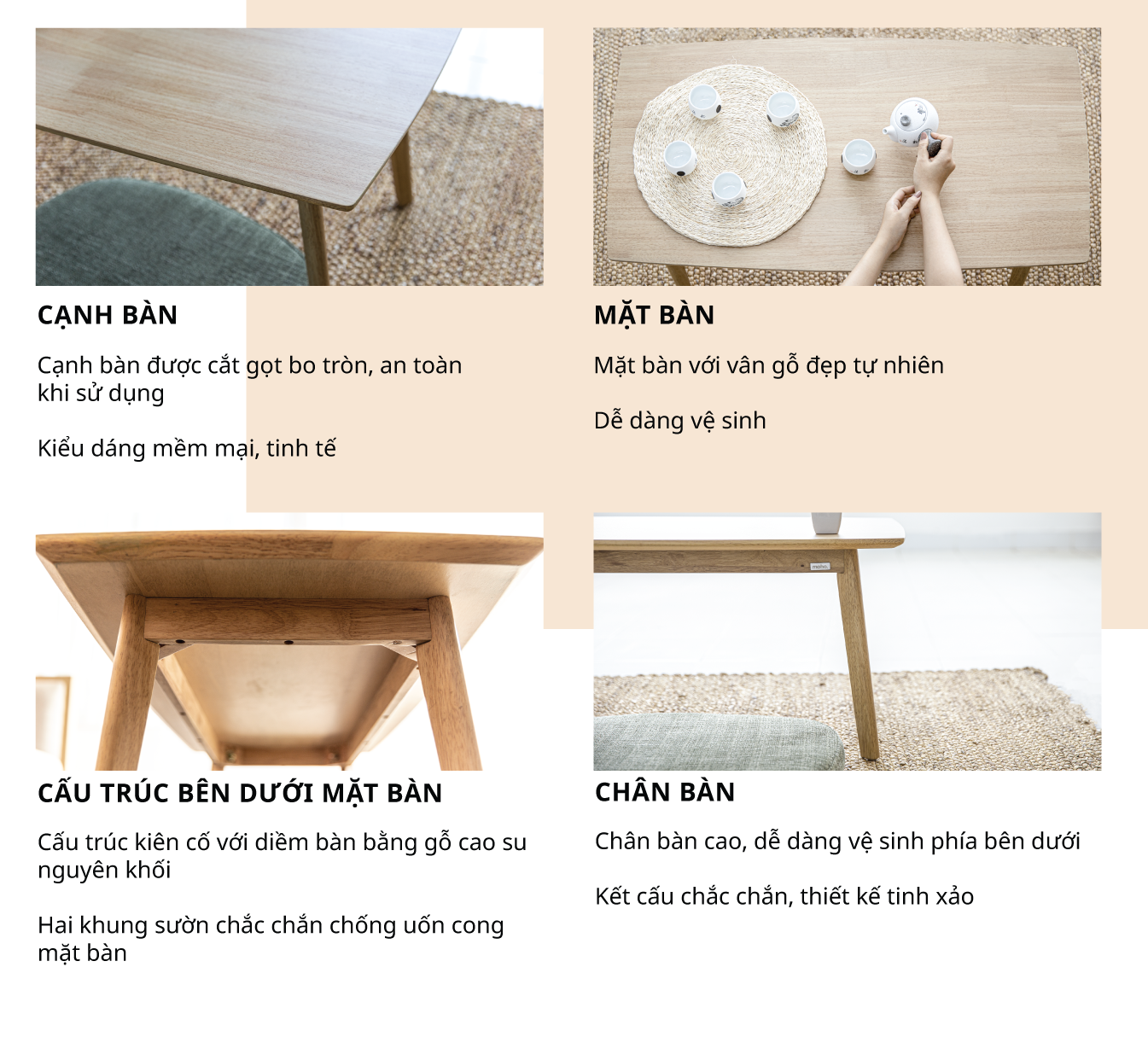 Chân bàn: Gỗ cao su tự nhiên nguyên khối