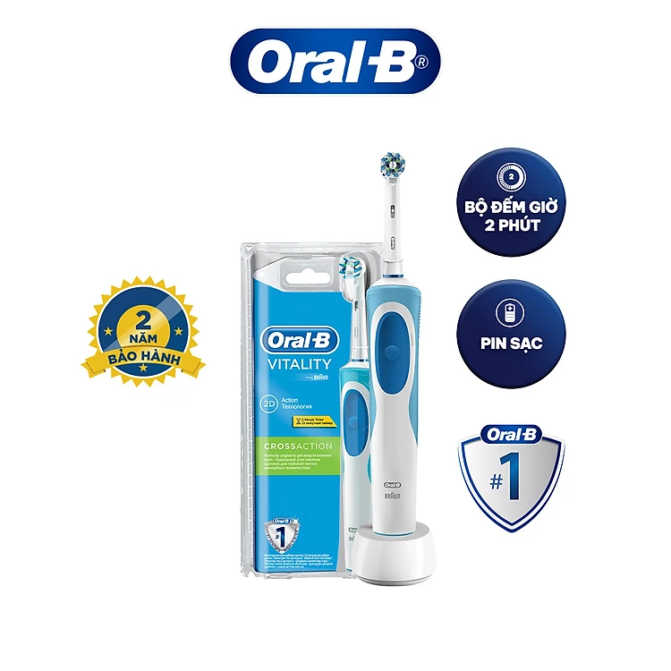 Bàn chải điện Oral-B Vitality CrossAction giúp đánh bay mảng bám nhiều hơn đến 100% và giúp làm sạch vượt trội so với bàn chải bằng tay thông thường. Công nghệ làm sạch tiên tiến: Đầu bàn chải Oral-B CrossAction có lông bàn chải nghiêng góc hoàn hảo để lách sâu vào kẽ răng và đánh bay mảng bám. Các tính năng nổi bật: