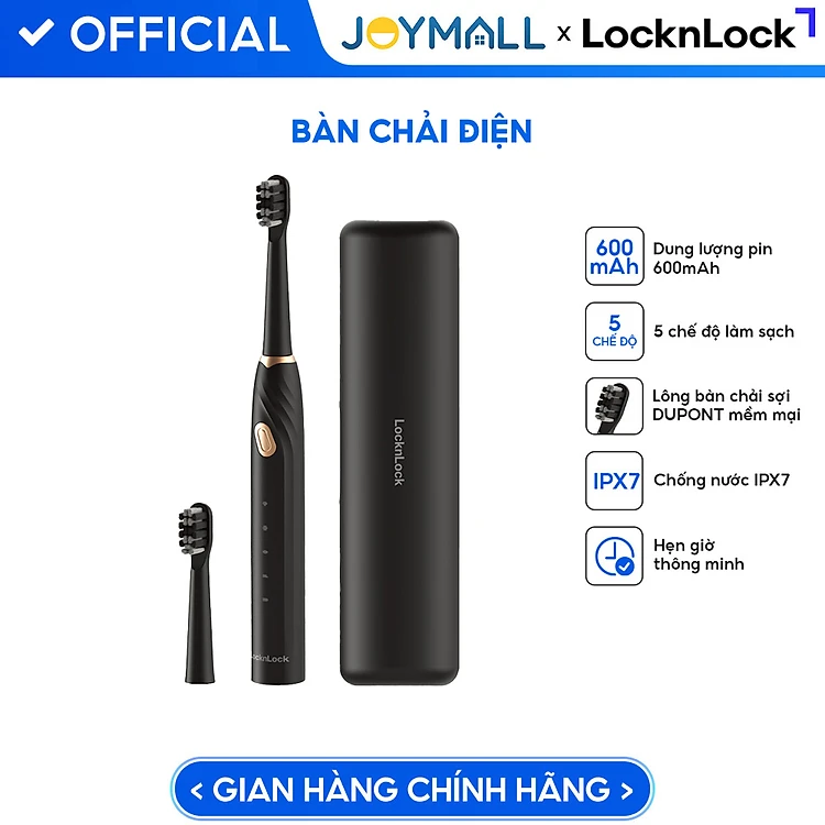 Bàn chải điện LocknLock ENR321BLK, Hàng chính hãng, 5 chế độ làm sạch, dung lượng pin 600mAh, có 4 đầu bàn chải - JoyMall