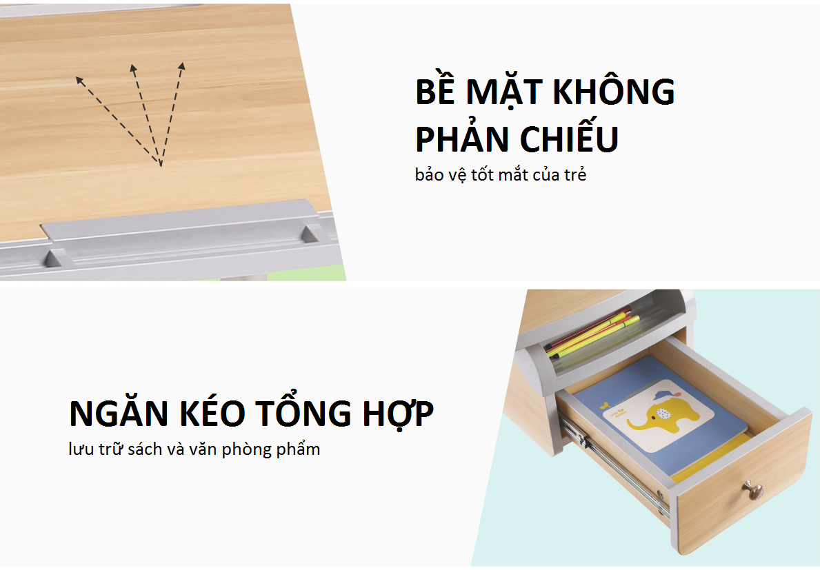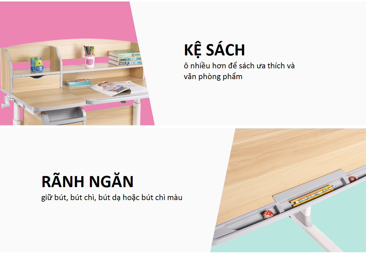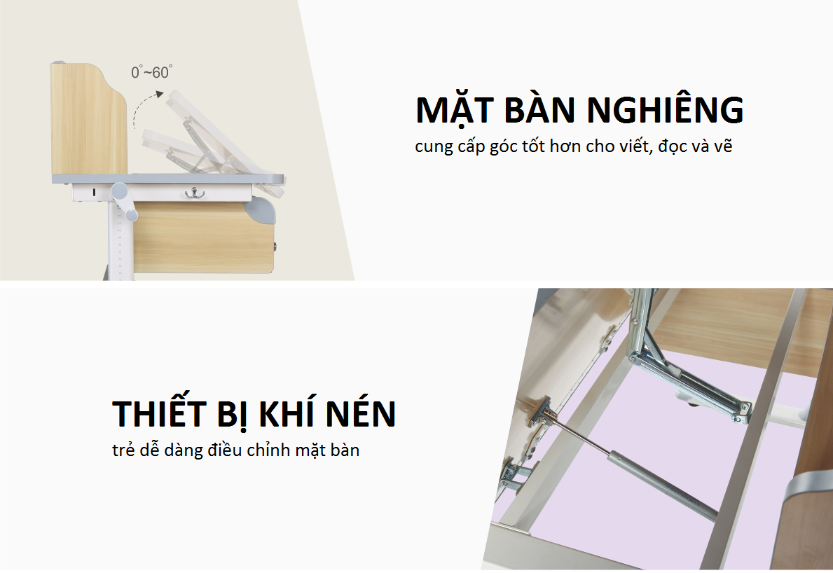 Mặt bàn có thể điều chỉnh độ nghiêng giúp trẻ viết, đọc vẽ dễ dàng.