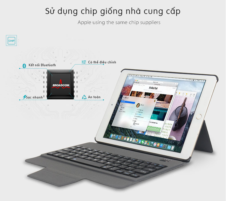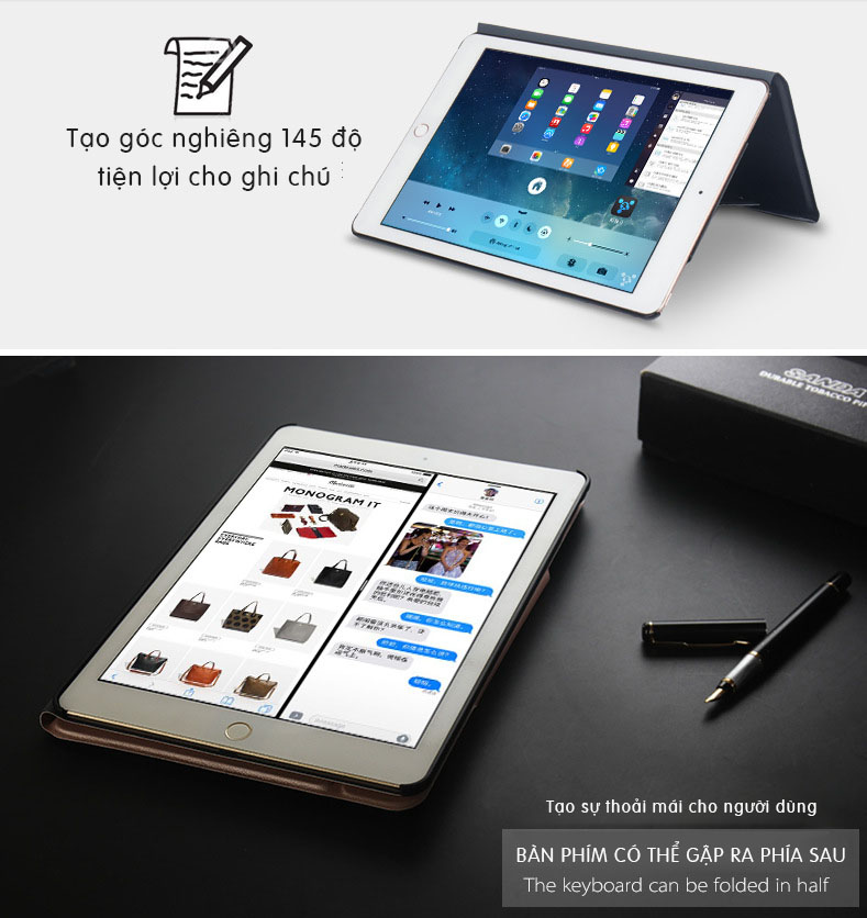 - Bàn phím kèm bao da có cấu trúc chân cắt kéo giúp giữ máy ở 120 độ - 145 độ thuận tiện cho việc ghi chép, viết,