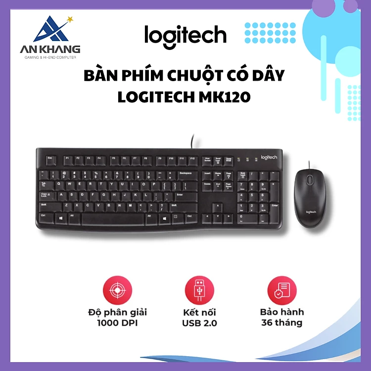 Bàn phím chuột có dây Logitech MK120 Thiết kế chống đổ tràn, có kích thước đầy đủ kèm bàn phím số, bền bỉ - Hàng Chính Hãng